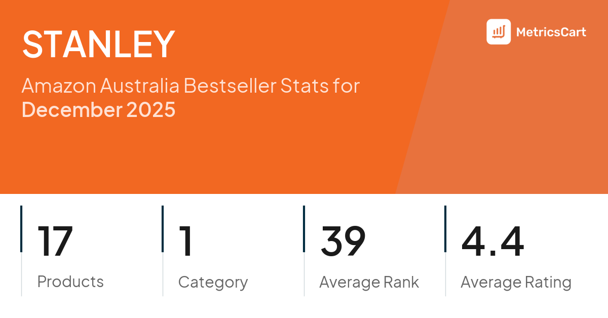 In December 2025, STANLEY appeared on Amazon Australia's bestseller lists with 17 unique products across 1 category. These products appeared in the category Kitchen & Dining. The brand's products on the bestseller lists were priced between $29.82 and $84.99, with an average price of $46.41. These bestselling products maintained an average rating of 4.4 based on 11K total ratings from customers who purchased products that appeared on the bestseller lists.