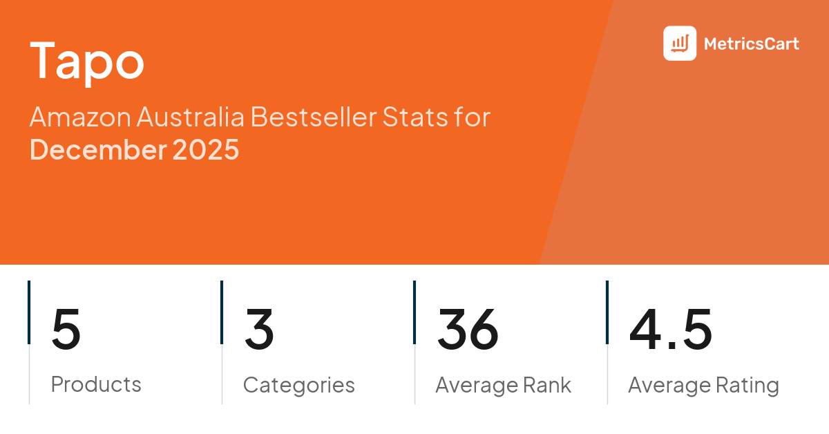 In December 2025, Tapo appeared on Amazon Australia's bestseller lists with 5 unique products across 3 categories. These products appeared in categories including Home Improvement, Baby, and Garden. The brand's products on the bestseller lists were priced between $17.80 and $93.99, with an average price of $22.13. These bestselling products maintained an average rating of 4.5 based on 154K total ratings from customers who purchased products that appeared on the bestseller lists.