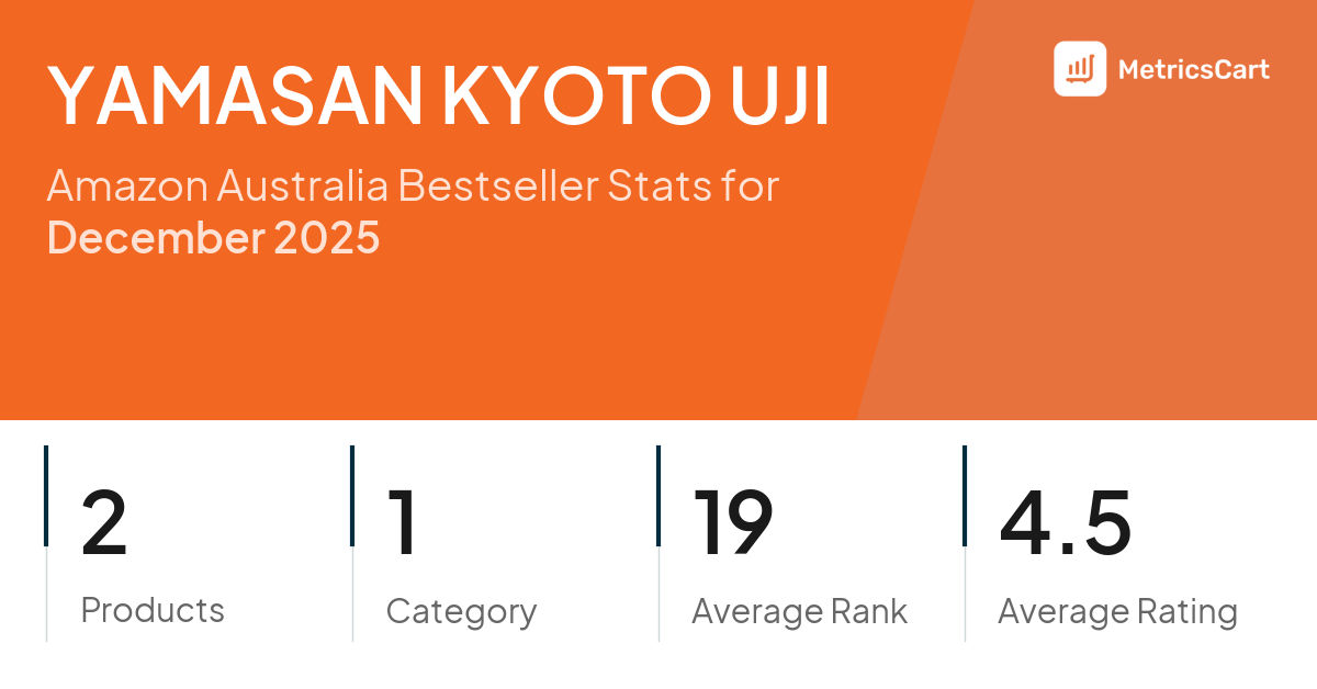 In December 2025, YAMASAN KYOTO UJI appeared on Amazon Australia's bestseller lists with 2 unique products across 1 category. These products appeared in the category Grocery. The brand's products on the bestseller lists were priced between $21.03 and $27.50, with an average price of $26.99. These bestselling products maintained an average rating of 4.5 based on 461 total ratings from customers who purchased products that appeared on the bestseller lists.