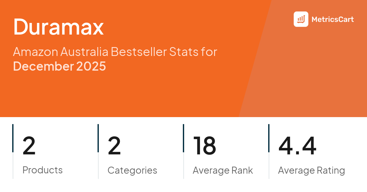 In December 2025, Duramax appeared on Amazon Australia's bestseller lists with 2 unique products across 2 categories. These products appeared in categories including Stationery & Office Products and Home Improvement. The brand's products on the bestseller lists were priced between $2.00 and $70.00, with an average price of $7.06. These bestselling products maintained an average rating of 4.4 based on 271 total ratings from customers who purchased products that appeared on the bestseller lists.