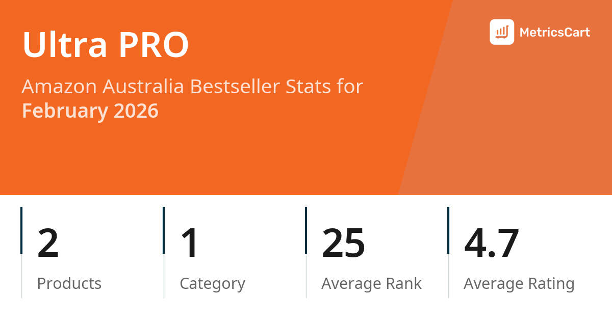 In February 2026, Ultra PRO appeared on Amazon Australia's bestseller lists with 2 unique products across 1 category. These products appeared in the category Toys & Games. The brand's products on the bestseller lists were priced between $6.50 and $17.00, with an average price of $8.96. These bestselling products maintained an average rating of 4.7 based on 6K total ratings from customers who purchased products that appeared on the bestseller lists.