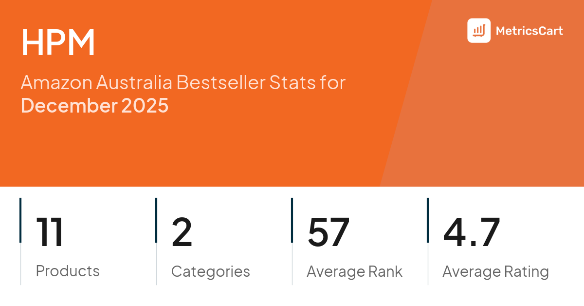 In December 2025, HPM appeared on Amazon Australia's bestseller lists with 11 unique products across 2 categories. These products appeared in categories including Home Improvement and Kitchen & Dining. The brand's products on the bestseller lists were priced between $3.77 and $15.70, with an average price of $9.33. These bestselling products maintained an average rating of 4.7 based on 5K total ratings from customers who purchased products that appeared on the bestseller lists.