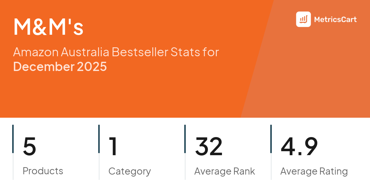 In December 2025, M&M's appeared on Amazon Australia's bestseller lists with 5 unique products across 1 category. These products appeared in the category Grocery. The brand's products on the bestseller lists were priced between $4.90 and $18.00, with an average price of $11.34. These bestselling products maintained an average rating of 4.9 based on 2K total ratings from customers who purchased products that appeared on the bestseller lists.