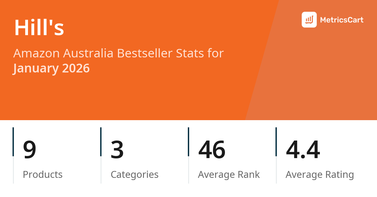 In January 2026, Hill's appeared on Amazon Australia's bestseller lists with 9 unique products across 3 categories. These products appeared in categories including Garden, Home Improvement, and Industrial & Scientific. The brand's products on the bestseller lists were priced between $4.39 and $49.99, with an average price of $13.24. These bestselling products maintained an average rating of 4.4 based on 1K total ratings from customers who purchased products that appeared on the bestseller lists.