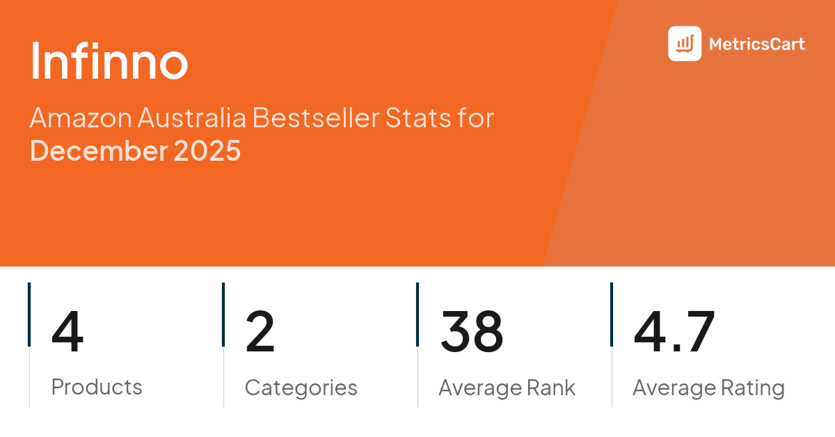 In December 2025, Infinno appeared on Amazon Australia's bestseller lists with 4 unique products across 2 categories. These products appeared in categories including Baby and Clothing, Shoes & Accessories. The brand's products on the bestseller lists were priced between $16.99 and $25.99, with an average price of $17.99. These bestselling products maintained an average rating of 4.7 based on 34K total ratings from customers who purchased products that appeared on the bestseller lists.