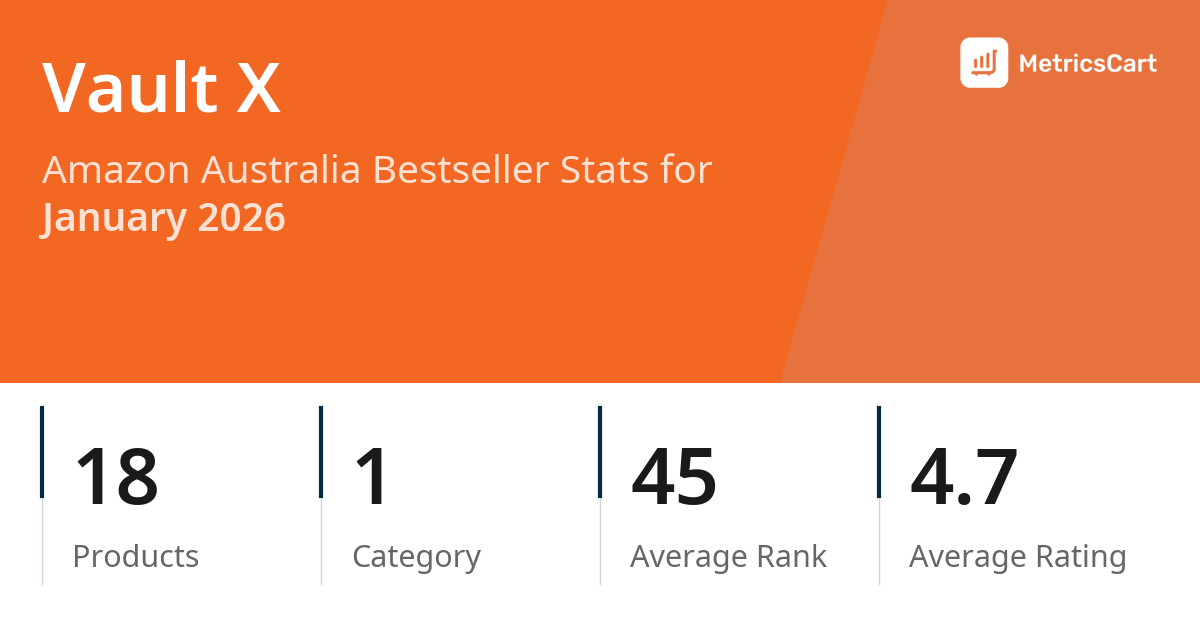In January 2026, Vault X appeared on Amazon Australia's bestseller lists with 18 unique products across 1 category. These products appeared in the category Toys & Games. The brand's products on the bestseller lists were priced between $7.49 and $55.49, with an average price of $33.99. These bestselling products maintained an average rating of 4.7 based on 28K total ratings from customers who purchased products that appeared on the bestseller lists.