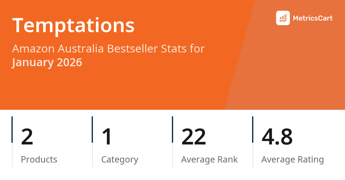 In January 2026, Temptations appeared on Amazon Australia's bestseller lists with 2 unique products across 1 category. These products appeared in the category Pet Supplies. The brand's products on the bestseller lists were priced between $11.00 and $13.50, with an average price of $12.72. These bestselling products maintained an average rating of 4.8 based on 854 total ratings from customers who purchased products that appeared on the bestseller lists.