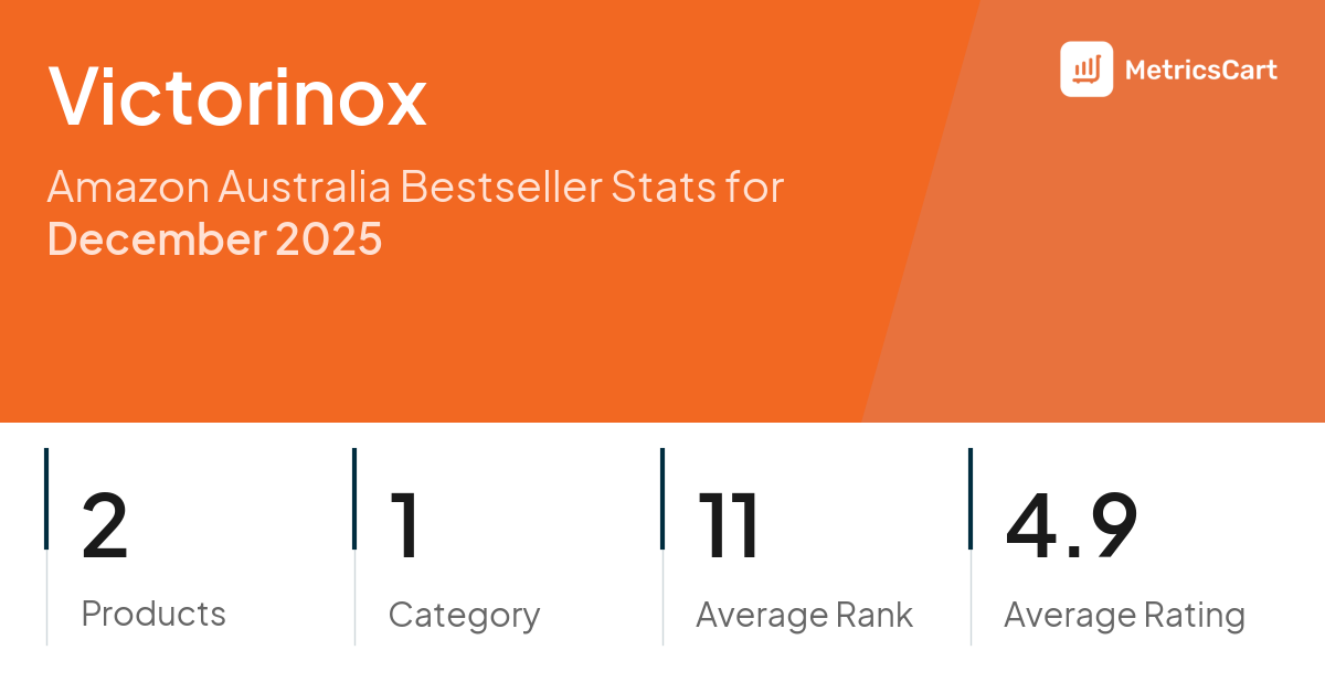 In December 2025, Victorinox appeared on Amazon Australia's bestseller lists with 2 unique products across 1 category. These products appeared in the category Kitchen & Dining. The brand's products on the bestseller lists were priced between $9.00 and $80.00, with an average price of $24.47. These bestselling products maintained an average rating of 4.9 based on 72K total ratings from customers who purchased products that appeared on the bestseller lists.