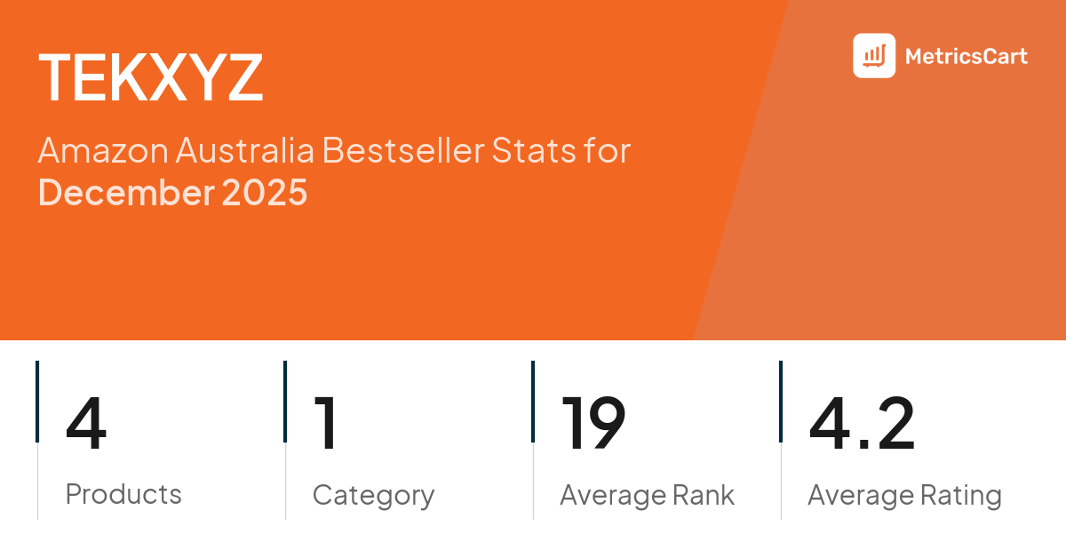 In December 2025, TEKXYZ appeared on Amazon Australia's bestseller lists with 4 unique products across 1 category. These products appeared in the category Sports, Fitness & Outdoors. The brand's products on the bestseller lists were priced between $39.99 and $52.99, with an average price of $46.49. These bestselling products maintained an average rating of 4.2 based on 36K total ratings from customers who purchased products that appeared on the bestseller lists.
