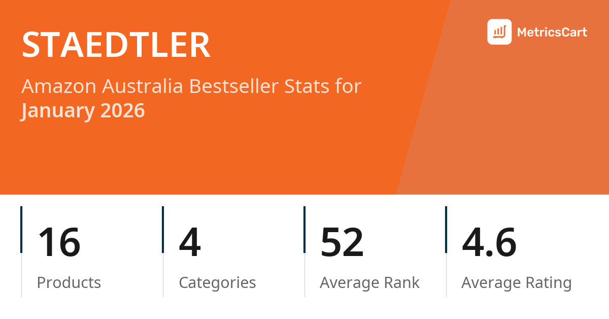 In January 2026, STAEDTLER appeared on Amazon Australia's bestseller lists with 16 unique products across 4 categories. These products appeared in categories including Stationery & Office Products, Home, and Amazon Devices & Accessories. The brand's products on the bestseller lists were priced between $1.75 and $81.70, with an average price of $10.70. These bestselling products maintained an average rating of 4.6 based on 241K total ratings from customers who purchased products that appeared on the bestseller lists.