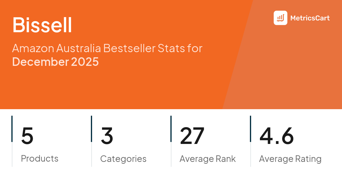 In December 2025, Bissell appeared on Amazon Australia's bestseller lists with 5 unique products across 3 categories. These products appeared in categories including Home, Automotive, and Pet Supplies. The brand's products on the bestseller lists were priced between $13.00 and $222.00, with an average price of $39.59. These bestselling products maintained an average rating of 4.6 based on 109K total ratings from customers who purchased products that appeared on the bestseller lists.