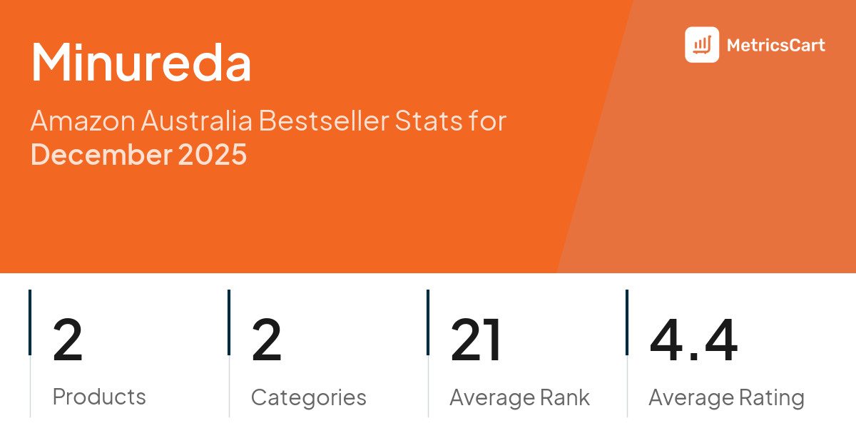 In December 2025, Minureda appeared on Amazon Australia's bestseller lists with 2 unique products across 2 categories. These products appeared in categories including Home and Toys & Games. The brand's products on the bestseller lists were priced between $12.10 and $18.89, with an average price of $14.66. These bestselling products maintained an average rating of 4.4 based on 324 total ratings from customers who purchased products that appeared on the bestseller lists.