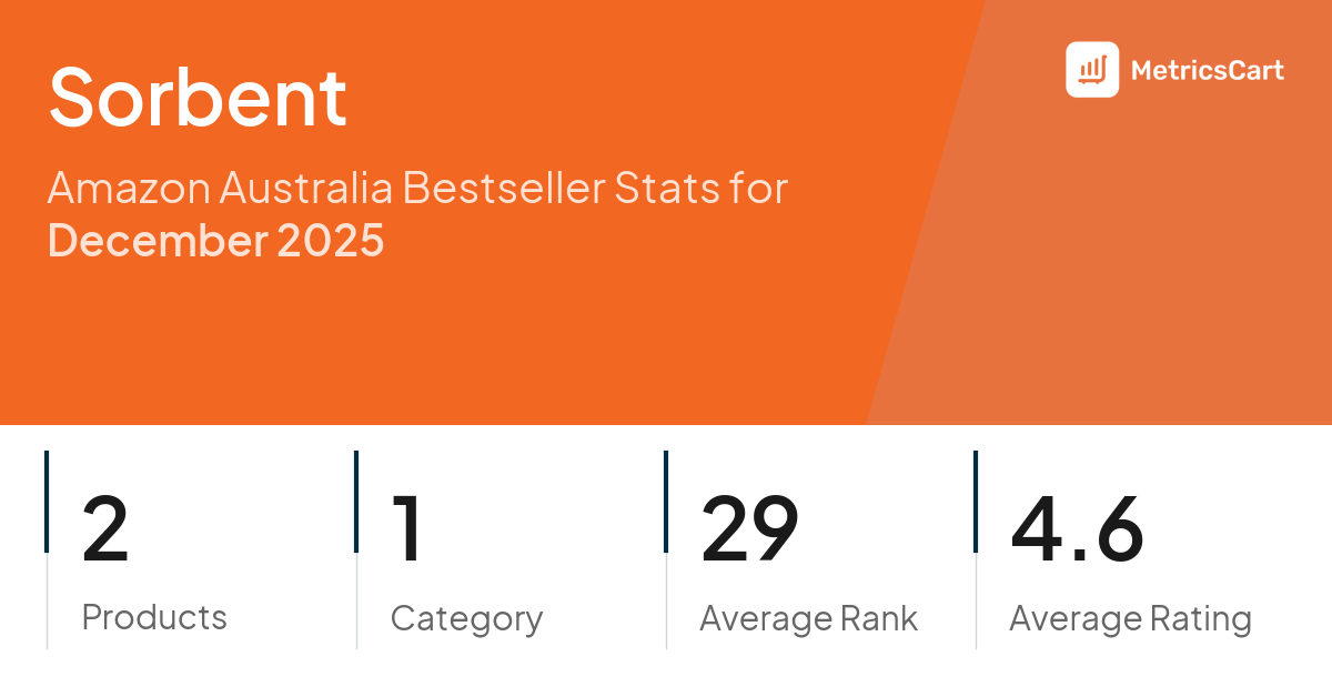 In December 2025, Sorbent appeared on Amazon Australia's bestseller lists with 2 unique products across 1 category. These products appeared in the category Health, Household & Personal Care. The brand's products on the bestseller lists were priced between $4.40 and $16.00, with an average price of $10.91. These bestselling products maintained an average rating of 4.6 based on 1K total ratings from customers who purchased products that appeared on the bestseller lists.