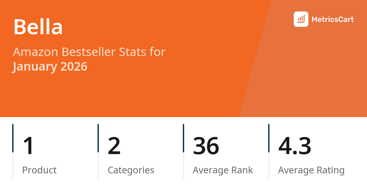 In January 2026, Bella appeared on Amazon's bestseller lists with 1 unique product across 2 categories. These products appeared in categories including Home & Kitchen and Kitchen & Dining. The brand's products on the bestseller lists were priced between $18.56 and $24.99, with an average price of $24.45. These bestselling products maintained an average rating of 4.3 based on 11K total ratings from customers who purchased products that appeared on the bestseller lists.