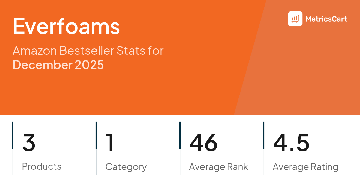 In December 2025, Everfoams appeared on Amazon's bestseller lists with 3 unique products across 1 category. These products appeared in the category Clothing, Shoes & Jewelry. The brand's products on the bestseller lists were priced between $10.37 and $29.99, with an average price of $15.92. These bestselling products maintained an average rating of 4.5 based on 34K total ratings from customers who purchased products that appeared on the bestseller lists.