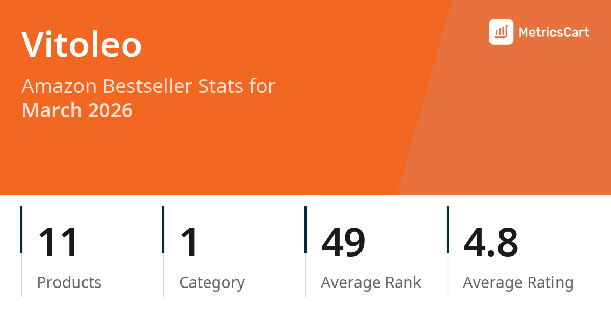In March 2026, Vitoleo appeared on Amazon's bestseller lists with 11 unique products across 1 category. These products appeared in the category Collectible Coins. The brand's products on the bestseller lists were priced between $7.41 and $9.99, with an average price of $8.90. These bestselling products maintained an average rating of 4.8 based on 161 total ratings from customers who purchased products that appeared on the bestseller lists.