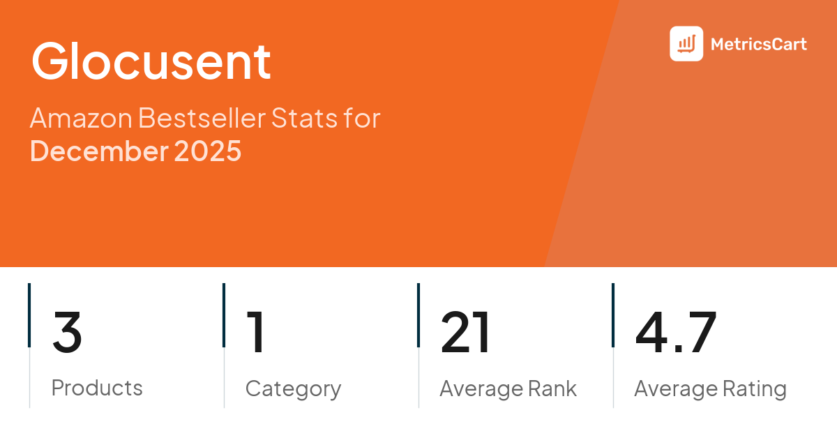 In December 2025, Glocusent appeared on Amazon's bestseller lists with 3 unique products across 1 category. These products appeared in the category Tools & Home Improvement. The brand's products on the bestseller lists were priced between $7.49 and $19.99, with an average price of $15.42. These bestselling products maintained an average rating of 4.7 based on 191K total ratings from customers who purchased products that appeared on the bestseller lists.