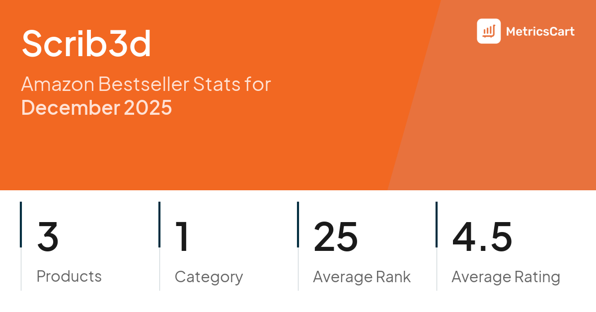 In December 2025, Scrib3d appeared on Amazon's bestseller lists with 3 unique products across 1 category. These products appeared in the category Industrial & Scientific. The brand's products on the bestseller lists were priced between $9.62 and $59.99, with an average price of $25.43. These bestselling products maintained an average rating of 4.5 based on 26K total ratings from customers who purchased products that appeared on the bestseller lists.