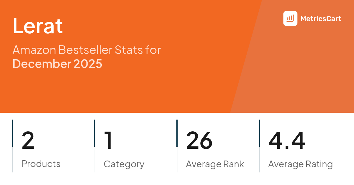 In December 2025, Lerat appeared on Amazon's bestseller lists with 2 unique products across 1 category. These products appeared in the category Sports & Outdoors. The brand's products on the bestseller lists were priced between $7.02 and $14.99, with an average price of $11.41. These bestselling products maintained an average rating of 4.4 based on 8K total ratings from customers who purchased products that appeared on the bestseller lists.