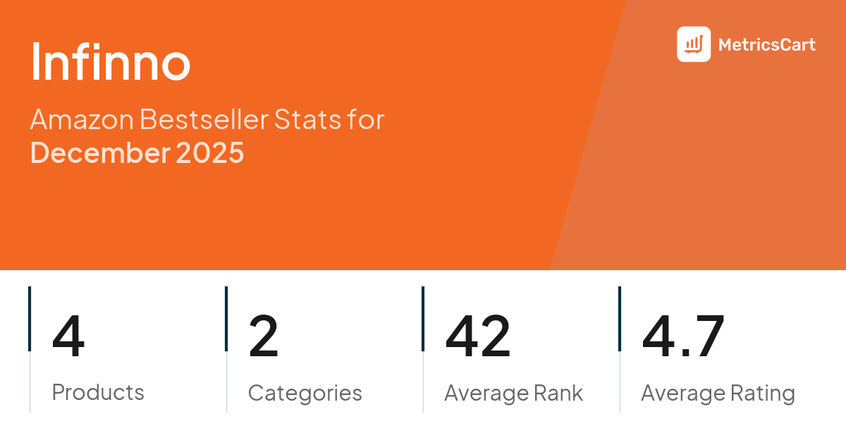 In December 2025, Infinno appeared on Amazon's bestseller lists with 4 unique products across 2 categories. These products appeared in categories including Baby and Toys & Games. The brand's products on the bestseller lists were priced between $6.66 and $9.99, with an average price of $8.85. These bestselling products maintained an average rating of 4.7 based on 35K total ratings from customers who purchased products that appeared on the bestseller lists.