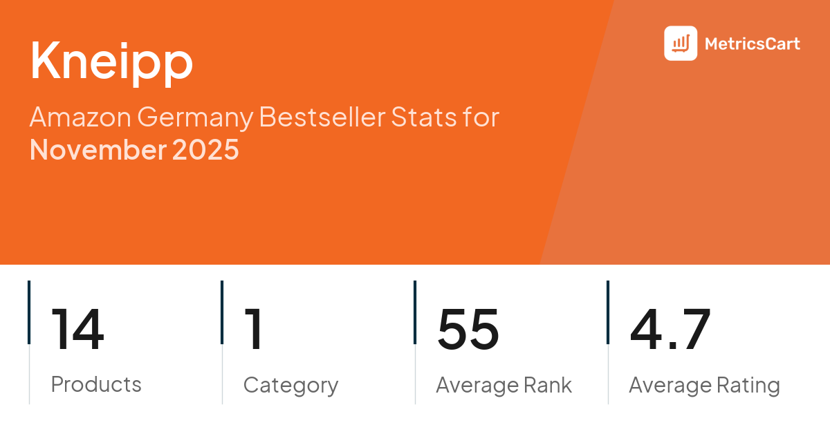 In November 2025, Kneipp appeared on Amazon Germany's bestseller lists with 14 unique products across 1 category. These products appeared in the category Beauty. The brand's products on the bestseller lists were priced between €0,80 and €41,97, with an average price of €7,30. These bestselling products maintained an average rating of 4.7 based on 22K total ratings from customers who purchased products that appeared on the bestseller lists.