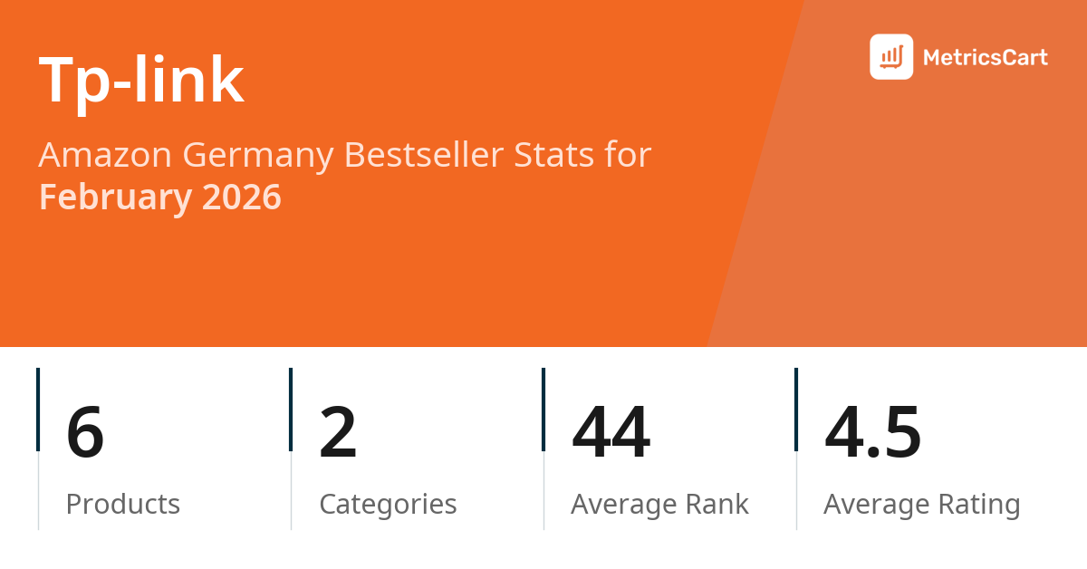 In February 2026, Tp-link appeared on Amazon Germany's bestseller lists with 6 unique products across 2 categories. These products appeared in categories including Computer & Accessories and DIY & Tools. The brand's products on the bestseller lists were priced between €6,71 and €32,96, with an average price of €18,46. These bestselling products maintained an average rating of 4.5 based on 232K total ratings from customers who purchased products that appeared on the bestseller lists.