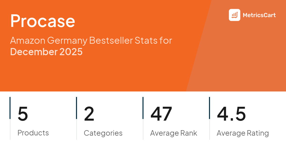 In December 2025, Procase appeared on Amazon Germany's bestseller lists with 5 unique products across 2 categories. These products appeared in categories including Computer & Accessories and DIY & Tools. The brand's products on the bestseller lists were priced between €6,36 and €10,99, with an average price of €8,89. These bestselling products maintained an average rating of 4.5 based on 320K total ratings from customers who purchased products that appeared on the bestseller lists.