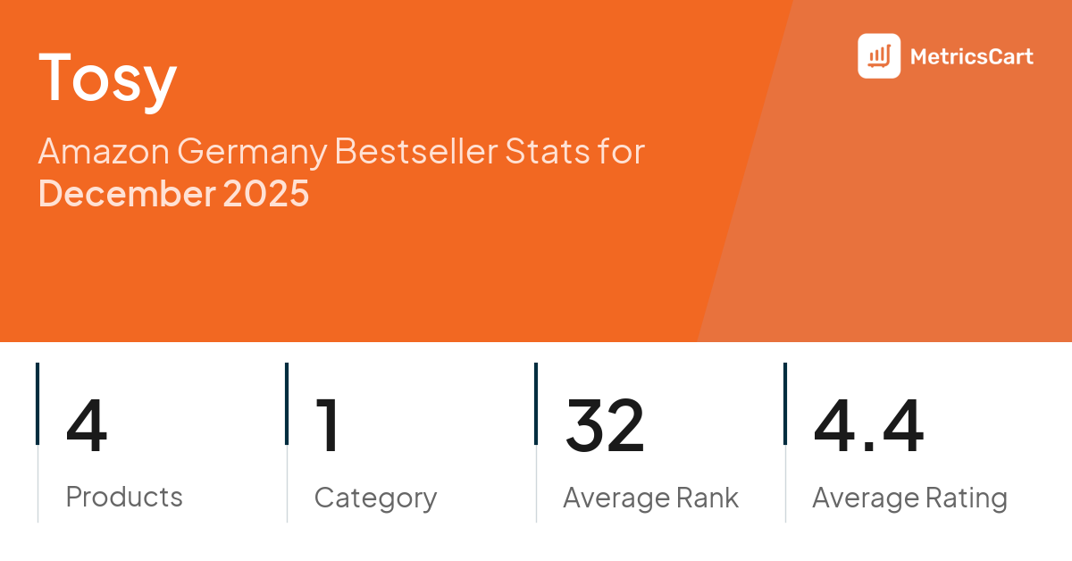 In December 2025, Tosy appeared on Amazon Germany's bestseller lists with 4 unique products across 1 category. These products appeared in the category Toys. The brand's products on the bestseller lists were priced between €8,87 and €29,99, with an average price of €18,63. These bestselling products maintained an average rating of 4.4 based on 24K total ratings from customers who purchased products that appeared on the bestseller lists.