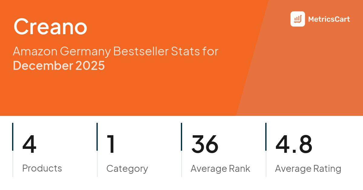 In December 2025, Creano appeared on Amazon Germany's bestseller lists with 4 unique products across 1 category. These products appeared in the category Grocery. The brand's products on the bestseller lists were priced between €9,99 and €12,74, with an average price of €11,82. These bestselling products maintained an average rating of 4.8 based on 12K total ratings from customers who purchased products that appeared on the bestseller lists.