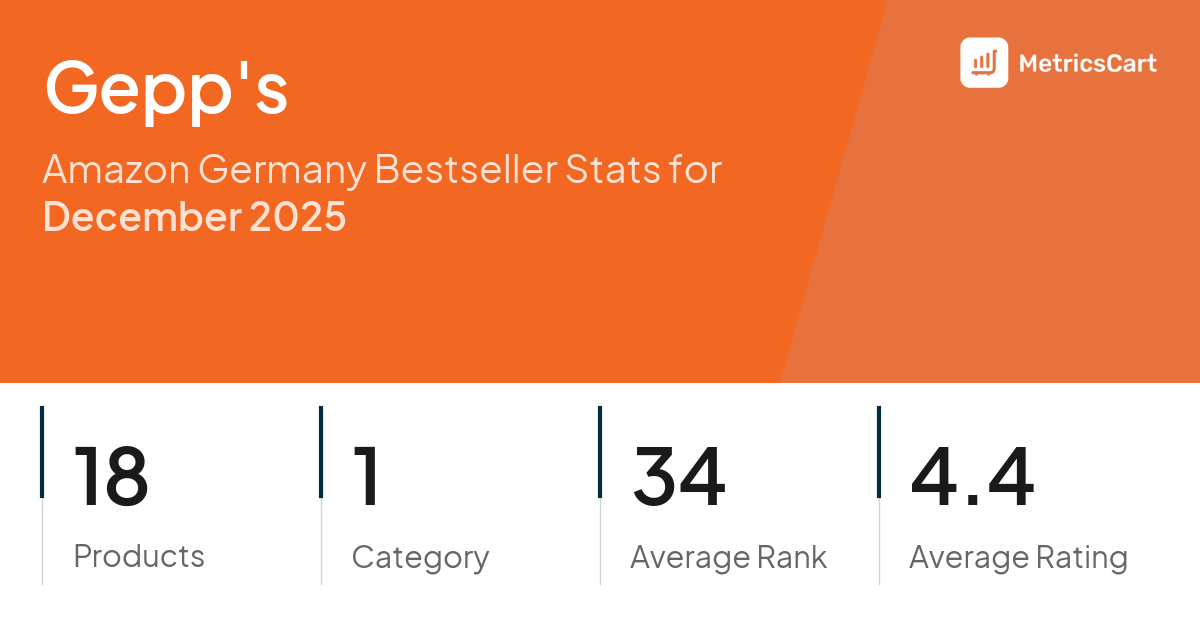 In December 2025, Gepp's appeared on Amazon Germany's bestseller lists with 18 unique products across 1 category. These products appeared in the category Grocery. The brand's products on the bestseller lists were priced between €9,99 and €46,99, with an average price of €15,87. These bestselling products maintained an average rating of 4.4 based on 11K total ratings from customers who purchased products that appeared on the bestseller lists.