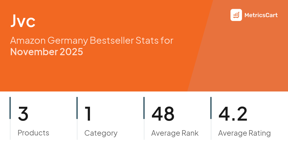 In November 2025, Jvc appeared on Amazon Germany's bestseller lists with 3 unique products across 1 category. These products appeared in the category Amazon Devices & Accessories. The brand's products on the bestseller lists were priced between €92,43 and €199,99, with an average price of €162,48. These bestselling products maintained an average rating of 4.2 based on 422 total ratings from customers who purchased products that appeared on the bestseller lists.