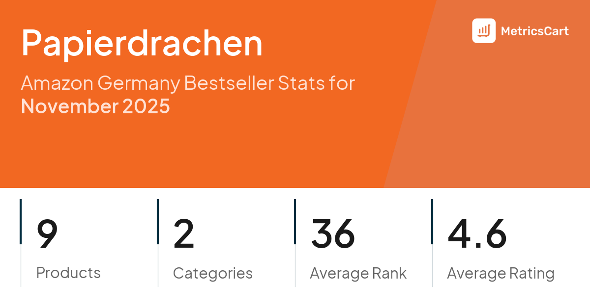 In November 2025, Papierdrachen appeared on Amazon Germany's bestseller lists with 9 unique products across 2 categories. These products appeared in categories including Stationery & Office Supplies and Home & Kitchen. The brand's products on the bestseller lists were priced between €6,90 and €14,90, with an average price of €9,61. These bestselling products maintained an average rating of 4.6 based on 9K total ratings from customers who purchased products that appeared on the bestseller lists.