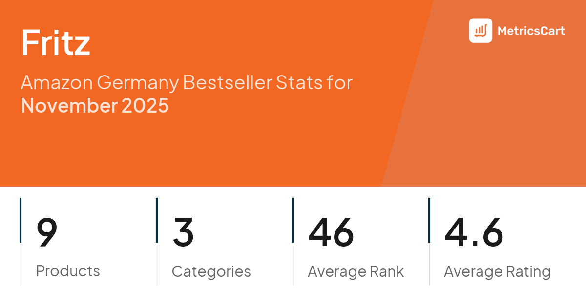 In November 2025, Fritz appeared on Amazon Germany's bestseller lists with 9 unique products across 3 categories. These products appeared in categories including Computer & Accessories, Electronics & Photo, and DIY & Tools. The brand's products on the bestseller lists were priced between €33,89 and €299,00, with an average price of €118,28. These bestselling products maintained an average rating of 4.6 based on 160K total ratings from customers who purchased products that appeared on the bestseller lists.