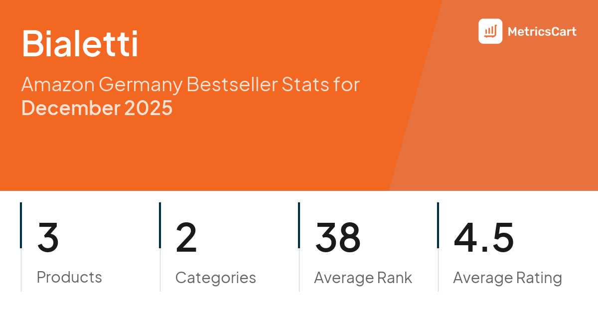 In December 2025, Bialetti appeared on Amazon Germany's bestseller lists with 3 unique products across 2 categories. These products appeared in categories including Home & Kitchen and Large Appliances. The brand's products on the bestseller lists were priced between €13,45 and €26,01, with an average price of €21,48. These bestselling products maintained an average rating of 4.5 based on 125K total ratings from customers who purchased products that appeared on the bestseller lists.