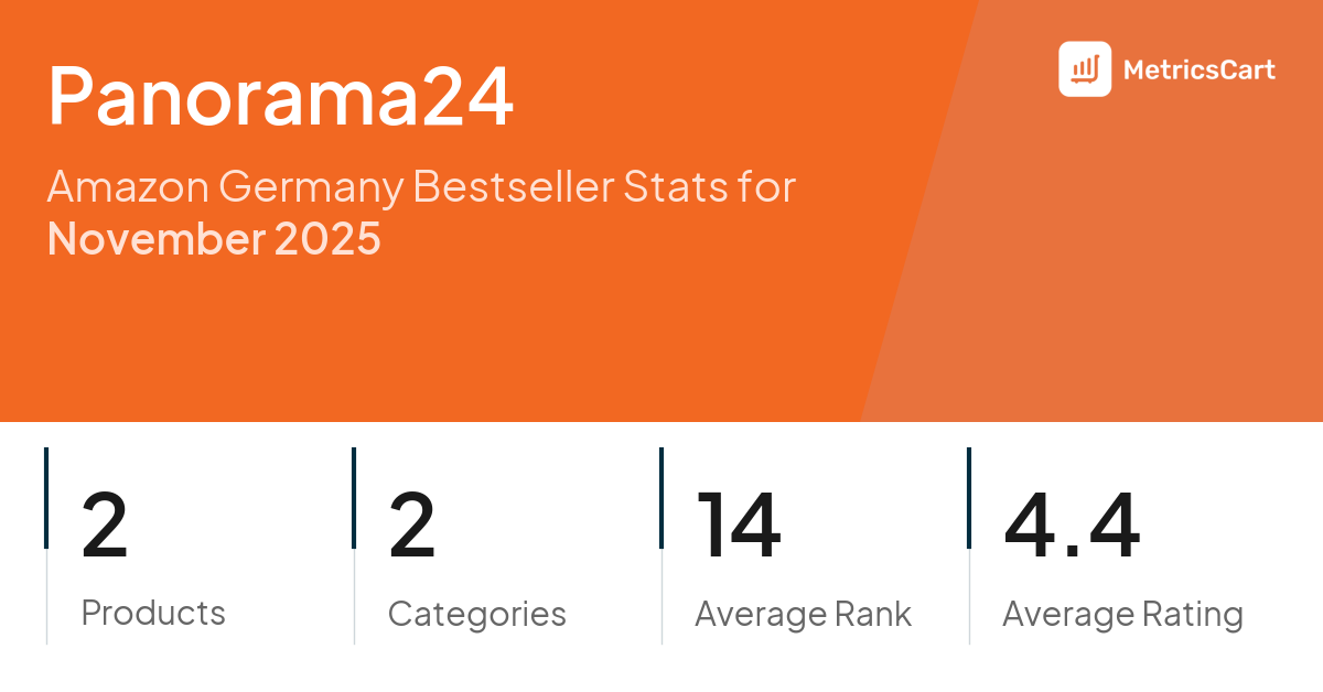 In November 2025, Panorama24 appeared on Amazon Germany's bestseller lists with 2 unique products across 2 categories. These products appeared in categories including DIY & Tools and Garden. The brand's products on the bestseller lists were priced between €39,99 and €44,90, with an average price of €41,63. These bestselling products maintained an average rating of 4.4 based on 18K total ratings from customers who purchased products that appeared on the bestseller lists.