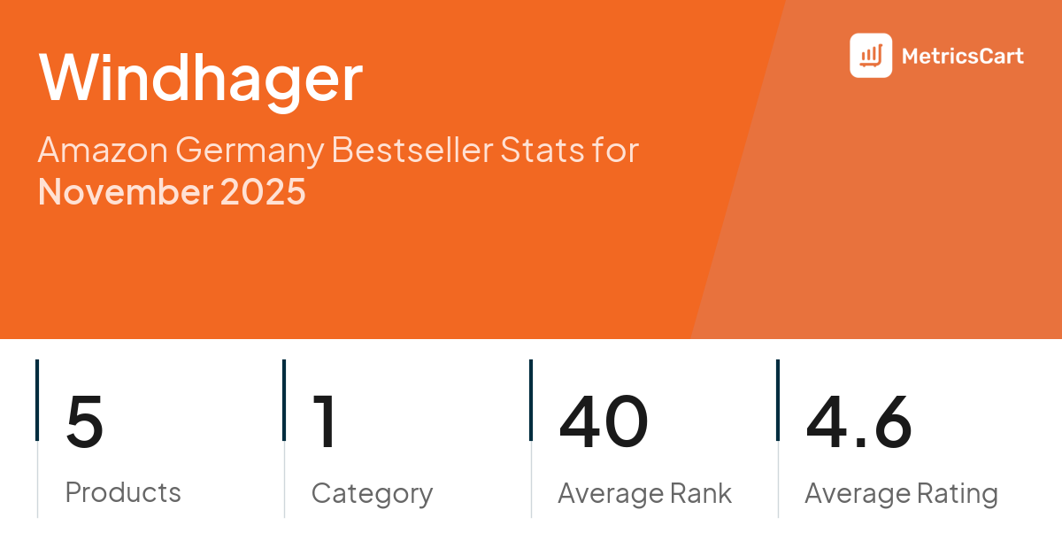 In November 2025, Windhager appeared on Amazon Germany's bestseller lists with 5 unique products across 1 category. These products appeared in the category Garden. The brand's products on the bestseller lists were priced between €4,61 and €9,99, with an average price of €7,57. These bestselling products maintained an average rating of 4.6 based on 9K total ratings from customers who purchased products that appeared on the bestseller lists.