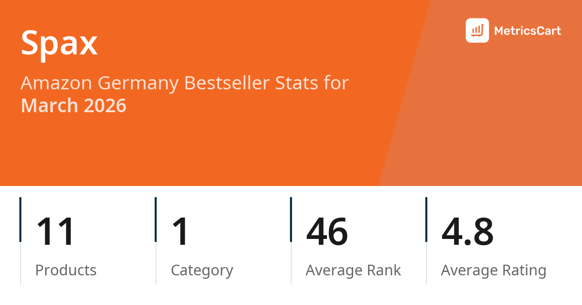 In March 2026, Spax appeared on Amazon Germany's bestseller lists with 11 unique products across 1 category. These products appeared in the category DIY & Tools. The brand's products on the bestseller lists were priced between €4,18 and €15,99, with an average price of €9,42. These bestselling products maintained an average rating of 4.8 based on 74K total ratings from customers who purchased products that appeared on the bestseller lists.