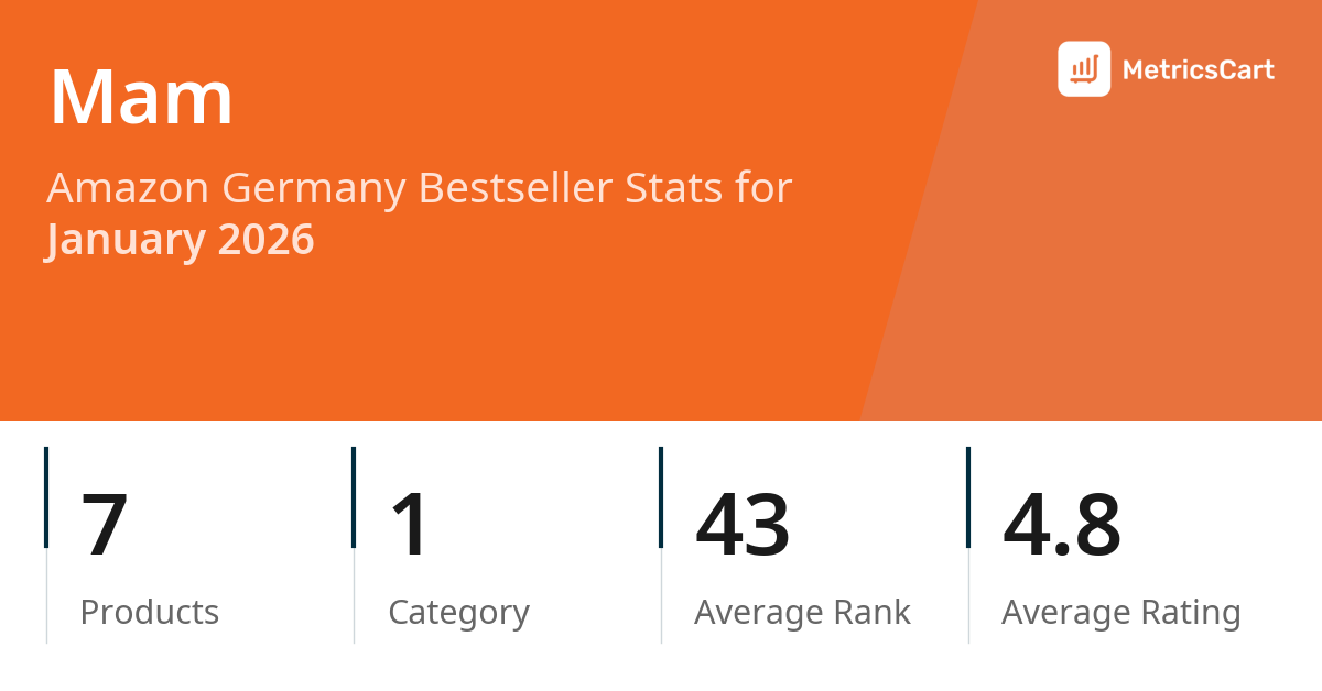 In January 2026, Mam appeared on Amazon Germany's bestseller lists with 7 unique products across 1 category. These products appeared in the category Baby Products. The brand's products on the bestseller lists were priced between €5,00 and €14,29, with an average price of €8,72. These bestselling products maintained an average rating of 4.8 based on 42K total ratings from customers who purchased products that appeared on the bestseller lists.