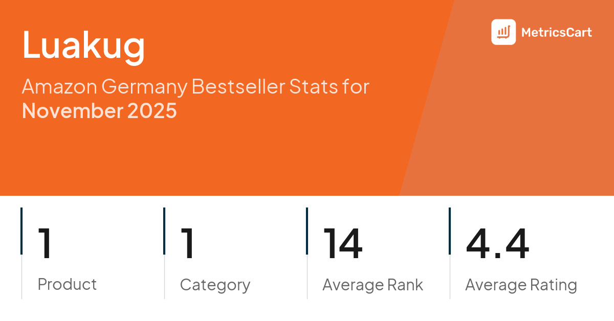In November 2025, Luakug appeared on Amazon Germany's bestseller lists with 1 unique product across 1 category. These products appeared in the category Camera & Photo. The brand's products on the bestseller lists were priced between €45,11 and €55,99, with an average price of €50,55. These bestselling products maintained an average rating of 4.4 based on 788 total ratings from customers who purchased products that appeared on the bestseller lists.
