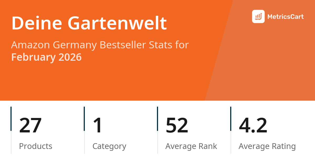 In February 2026, Deine Gartenwelt appeared on Amazon Germany's bestseller lists with 27 unique products across 1 category. These products appeared in the category Garden. The brand's products on the bestseller lists were priced between €1,99 and €2,99, with an average price of €2,01. These bestselling products maintained an average rating of 4.2 based on 83K total ratings from customers who purchased products that appeared on the bestseller lists.