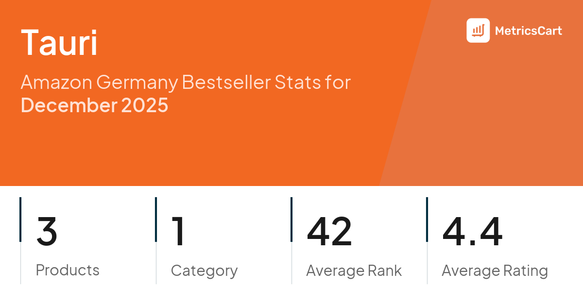In December 2025, Tauri appeared on Amazon Germany's bestseller lists with 3 unique products across 1 category. These products appeared in the category Electronics & Photo. The brand's products on the bestseller lists were priced between €9,34 and €10,99, with an average price of €9,89. These bestselling products maintained an average rating of 4.4 based on 124K total ratings from customers who purchased products that appeared on the bestseller lists.