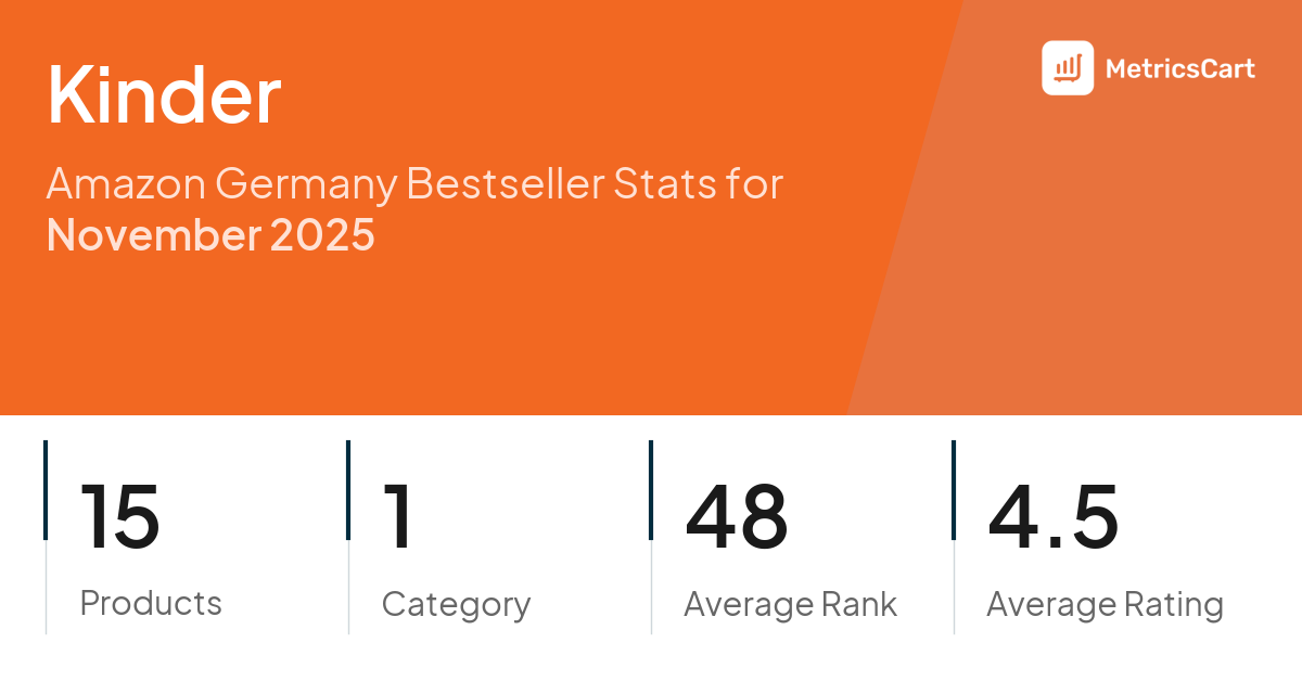 In November 2025, Kinder appeared on Amazon Germany's bestseller lists with 15 unique products across 1 category. These products appeared in the category Grocery. The brand's products on the bestseller lists were priced between €2,49 and €22,99, with an average price of €8,28. These bestselling products maintained an average rating of 4.5 based on 27K total ratings from customers who purchased products that appeared on the bestseller lists.