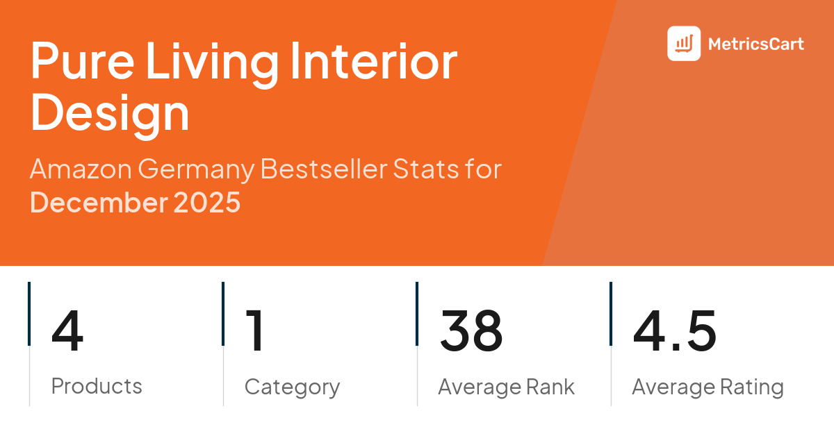 In December 2025, Pure Living Interior Design appeared on Amazon Germany's bestseller lists with 4 unique products across 1 category. These products appeared in the category Home & Kitchen. The brand's products on the bestseller lists were priced between €49,95 and €199,95, with an average price of €113,28. These bestselling products maintained an average rating of 4.5 based on 27K total ratings from customers who purchased products that appeared on the bestseller lists.