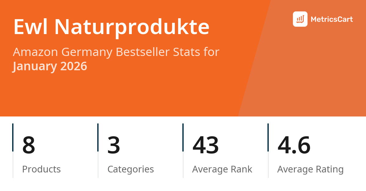 In January 2026, Ewl Naturprodukte appeared on Amazon Germany's bestseller lists with 8 unique products across 3 categories. These products appeared in categories including Grocery, Garden, and Pet Supplies. The brand's products on the bestseller lists were priced between €6,79 and €27,49, with an average price of €12,53. These bestselling products maintained an average rating of 4.6 based on 37K total ratings from customers who purchased products that appeared on the bestseller lists.