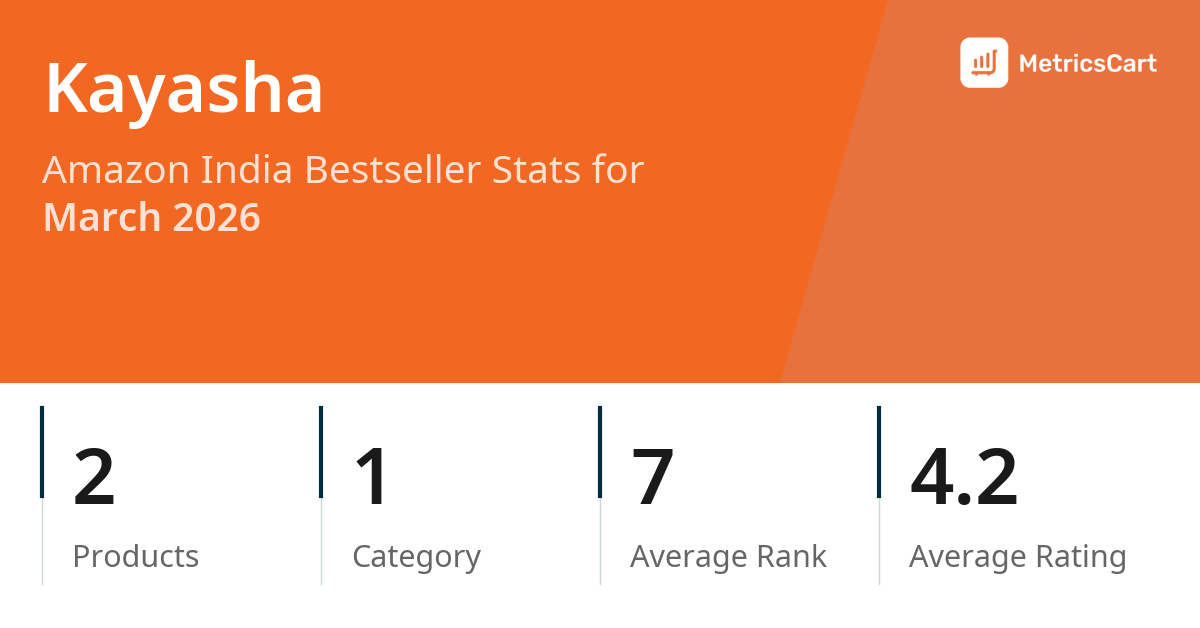 In March 2026, Kayasha appeared on Amazon India's bestseller lists with 2 unique products across 1 category. These products appeared in the category Jewellery. The brand's products on the bestseller lists were priced between ₹299.00 and ₹549.00, with an average price of ₹470.67. These bestselling products maintained an average rating of 4.2 based on 26 total ratings from customers who purchased products that appeared on the bestseller lists.