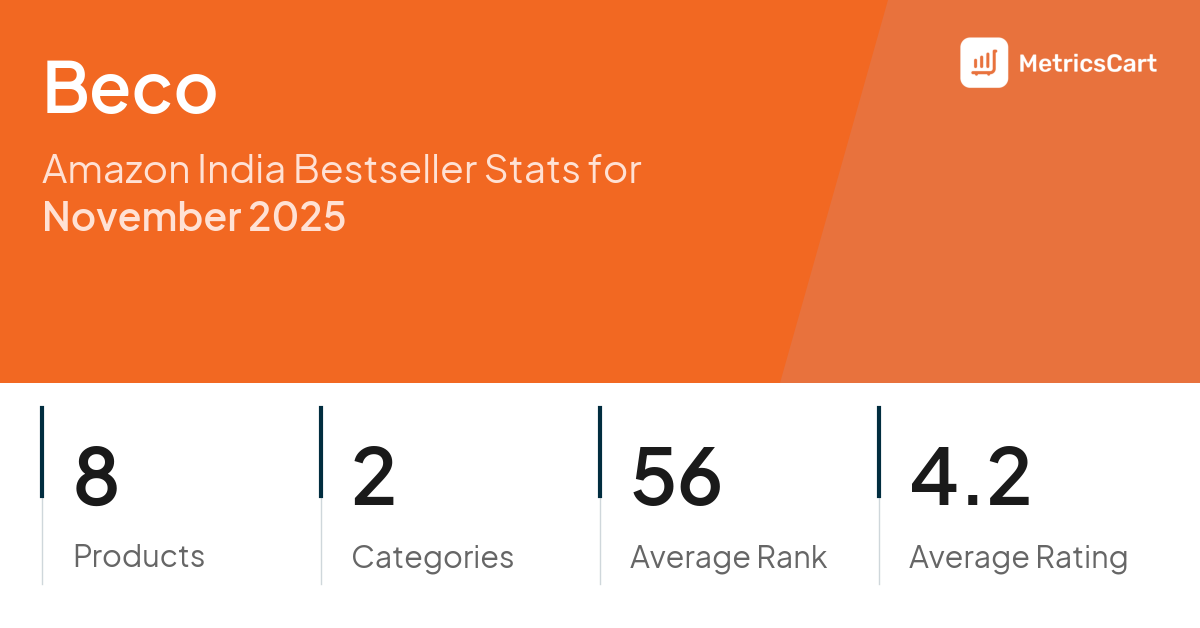 In November 2025, Beco appeared on Amazon India's bestseller lists with 8 unique products across 2 categories. These products appeared in categories including Health & Personal Care and Home & Kitchen. The brand's products on the bestseller lists were priced between ₹168.00 and ₹439.00, with an average price of ₹219.85. These bestselling products maintained an average rating of 4.2 based on 42K total ratings from customers who purchased products that appeared on the bestseller lists.