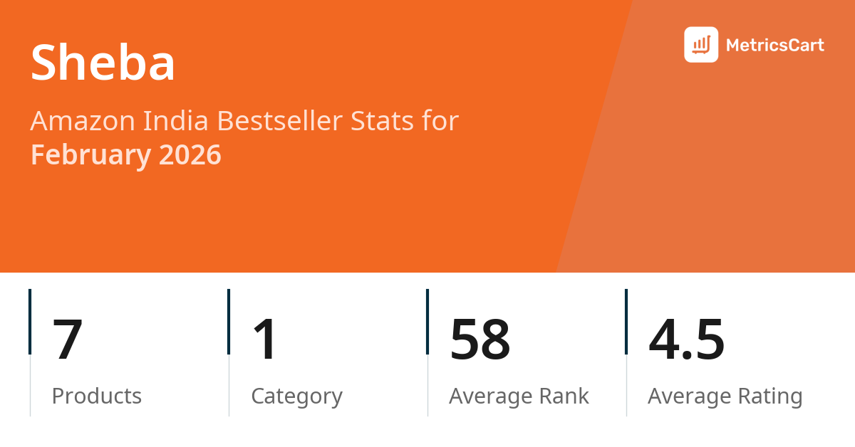 In February 2026, Sheba appeared on Amazon India's bestseller lists with 7 unique products across 1 category. These products appeared in the category Pet Supplies. The brand's products on the bestseller lists were priced between ₹107.00 and ₹1,940.00, with an average price of ₹740.51. These bestselling products maintained an average rating of 4.5 based on 8K total ratings from customers who purchased products that appeared on the bestseller lists.