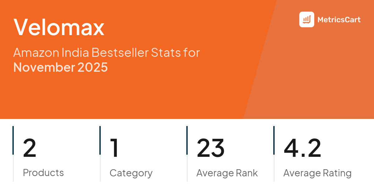 In November 2025, Velomax appeared on Amazon India's bestseller lists with 2 unique products across 1 category. These products appeared in the category Musical Instruments. The brand's products on the bestseller lists were priced between ₹921.00 and ₹2,799.00, with an average price of ₹1,661.05. These bestselling products maintained an average rating of 4.2 based on 1K total ratings from customers who purchased products that appeared on the bestseller lists.