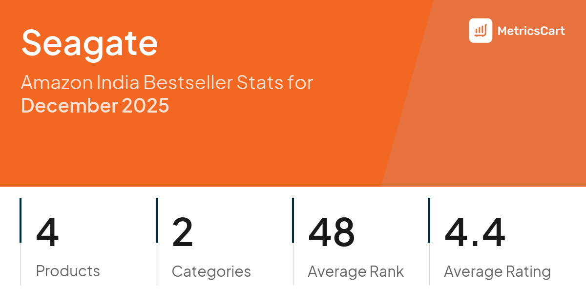In December 2025, Seagate appeared on Amazon India's bestseller lists with 4 unique products across 2 categories. These products appeared in categories including Computers & Accessories and Electronics. The brand's products on the bestseller lists were priced between ₹5,849.00 and ₹8,199.00, with an average price of ₹7,273.12. These bestselling products maintained an average rating of 4.4 based on 101K total ratings from customers who purchased products that appeared on the bestseller lists.