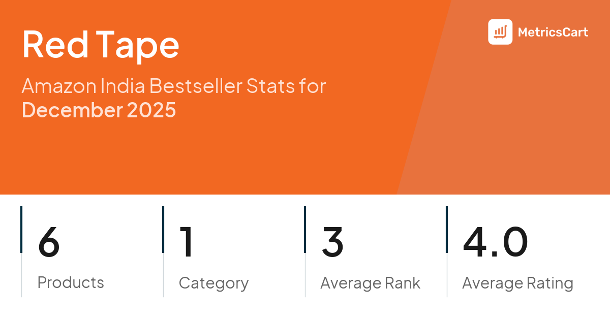 In December 2025, Red Tape appeared on Amazon India's bestseller lists with 6 unique products across 1 category. These products appeared in the category Shoes & Handbags. The brand's products on the bestseller lists were priced between ₹499.00 and ₹599.00, with an average price of ₹523.14. These bestselling products maintained an average rating of 4.0 based on 8K total ratings from customers who purchased products that appeared on the bestseller lists.